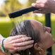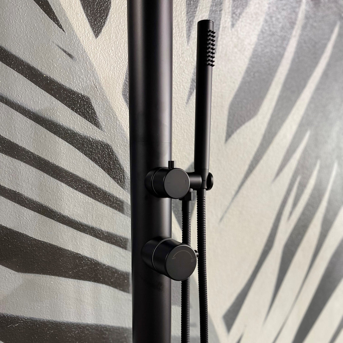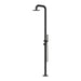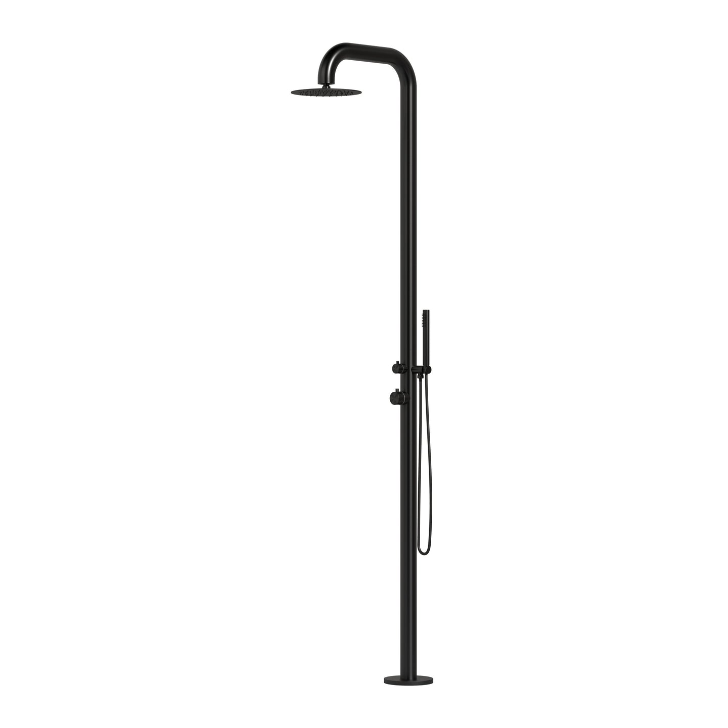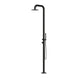 Freestanding outdoor shower with pressure balance valve, two-way diverter, hand shower, and rain shower head made of 316 marine grade matte black stainless steel.