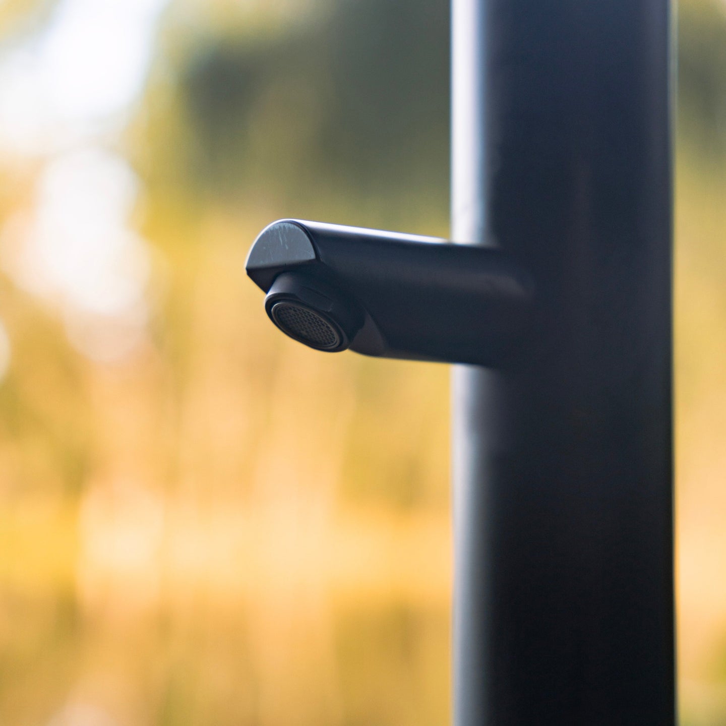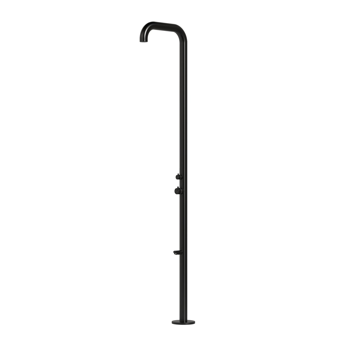 Freestanding outdoor shower with pressure balance valve, two-way diverter, and foot wash made of 316 marine grade matte black stainless steel.